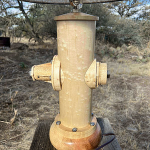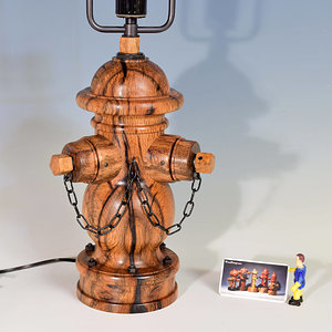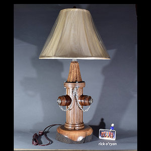 Emory oak, of the red oak group. The tree had rot at the base, which caused it to come down. There are some real nice colors near that rot. The emory oak is the large oak in the Burro Mountains, the southwest part of the Gila National Forest. There were many faults and cracks, so after drying, I cast this in epoxy casting resin. This #hydrant is modeled after a design produced by Glamorgan Works, of Lynchburg, VA, which was patented in 1897. The base is 5-1/2" diameter, and 13-3/8" to the base of the harp. It is 8" across the port cap nuts. The lamp switch is in the right port, activated by th