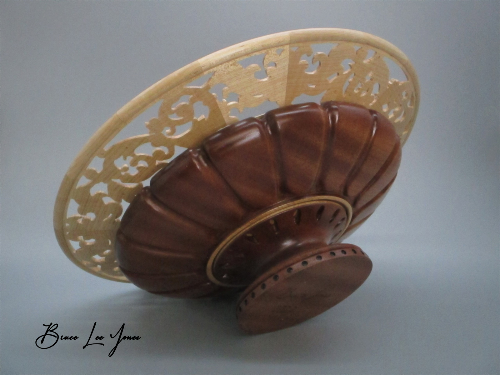 This partly segmented piece is made from Curly Maple and Ribbon Sapele. The base bowl section was first turned, then hand carved with 16 flutes. There is a 1/8" layer of curly Maple in between the bowl and foot that has a bead turned in to it. After carving the outer bowl section the piece went back on the lathe to turn the rim that had been turned previously to match the bowls angle and glued onto the bowl . Then the design was hand drawn and hand carved into the rim. The piece finished at 13 1/2" D 5" Tall. The final finish is satin lacquer.