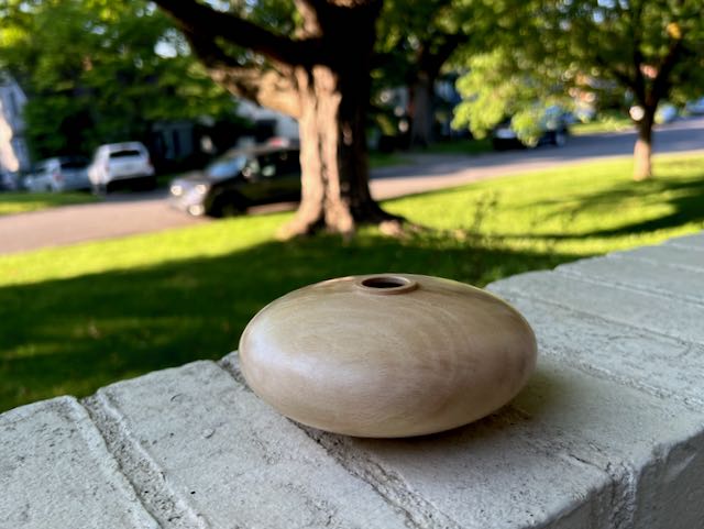 Continuing with my goal of a new hollow form every week, each one a different shape. This one's beech, 5" diameter and 3" tall. Still struggling with going really thin on the walls, but getting better.