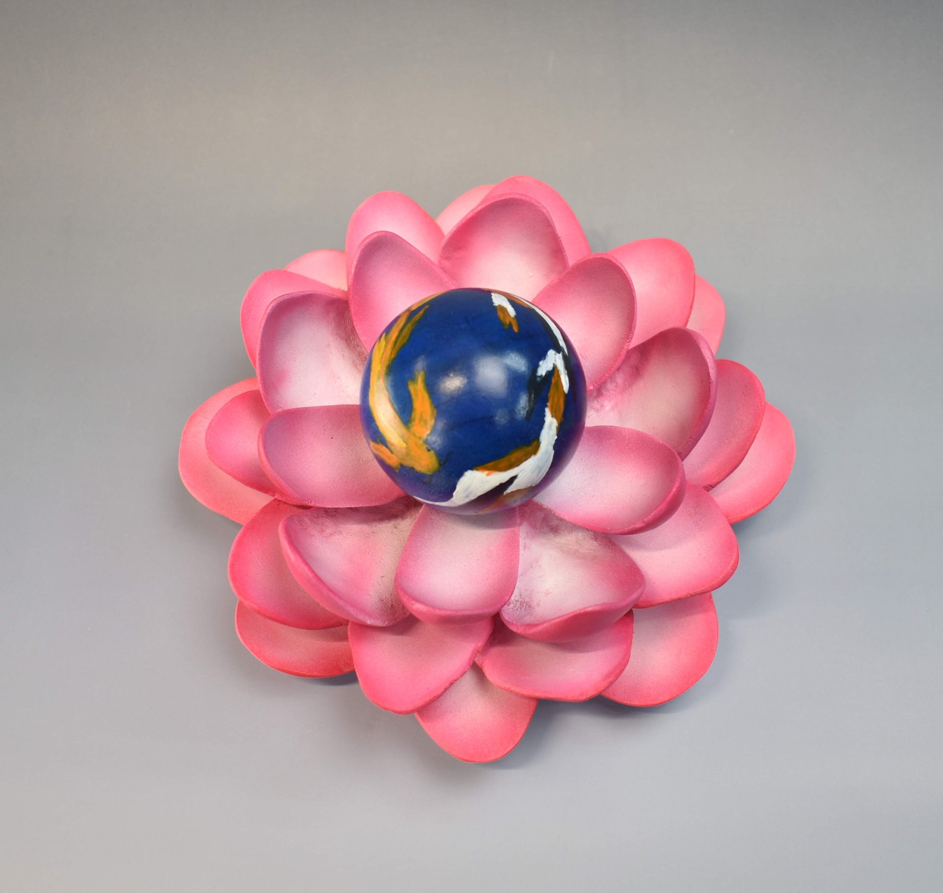 The lotus was made from 3 cotton wood bowls that were carved and airbrushed. The sphere in the center is cotton wood that i dyed black then sanded back and dyed blue. Then hand painted koi with brushes.