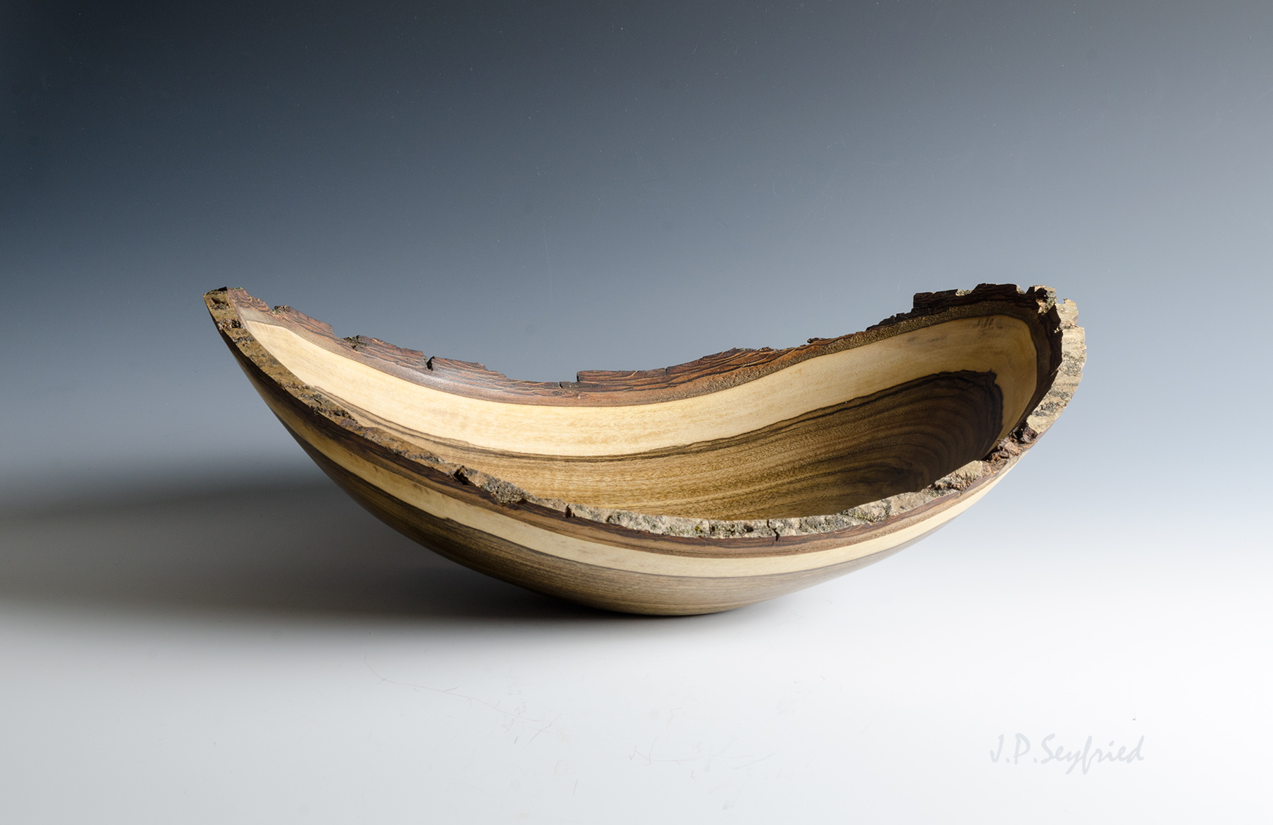 This once-turned natural edge English Walnut bowl is about 15” x 10 ¾” x 5”. I left it a bit thick to help keep the bark on; it seems to be on solidly.
