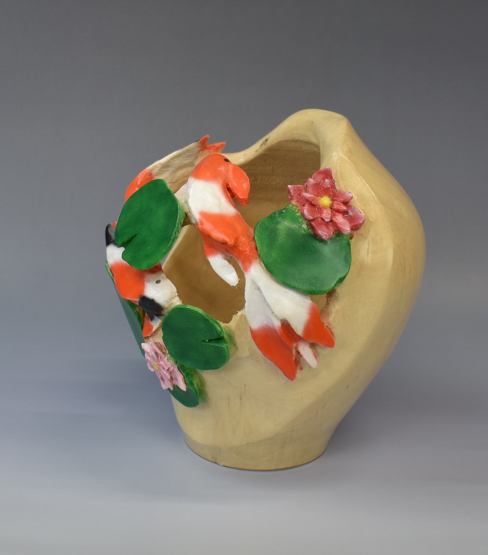 cotton wood hollow form with carved koi, lily pads, and flowers that are airbrushed
