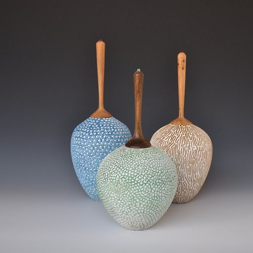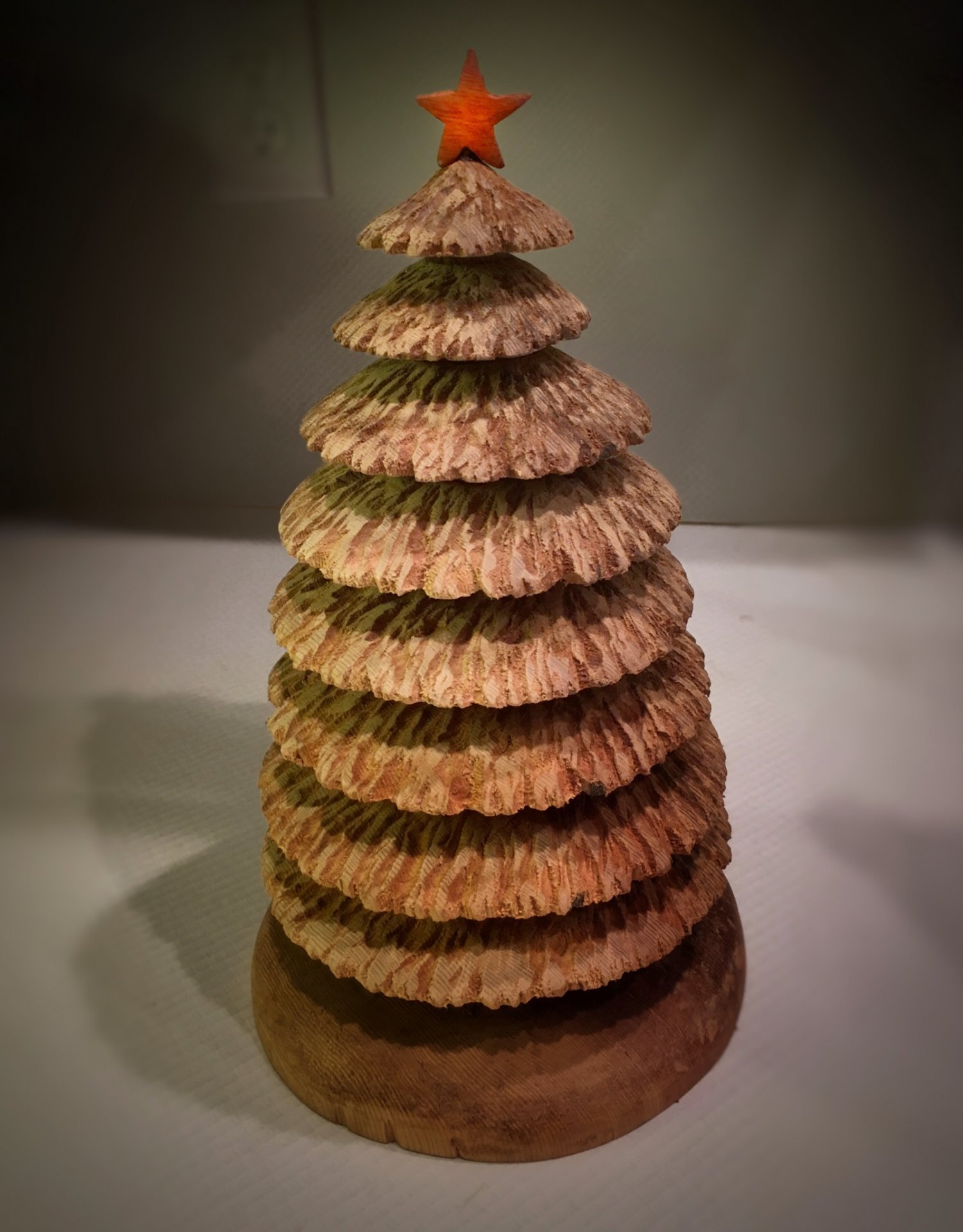9” x 4” Cedar turned and power carved Christmas tree topped with a simple Padauk star. To a achieve the visual effect, I aggressively power carved vertical lines and indentions. Next, I applied heavy amounts of diluted shellac. Lastly, I sanded down all high spots creating lighter contrasting colors and and smooth surfaces atop sharp edge areas.