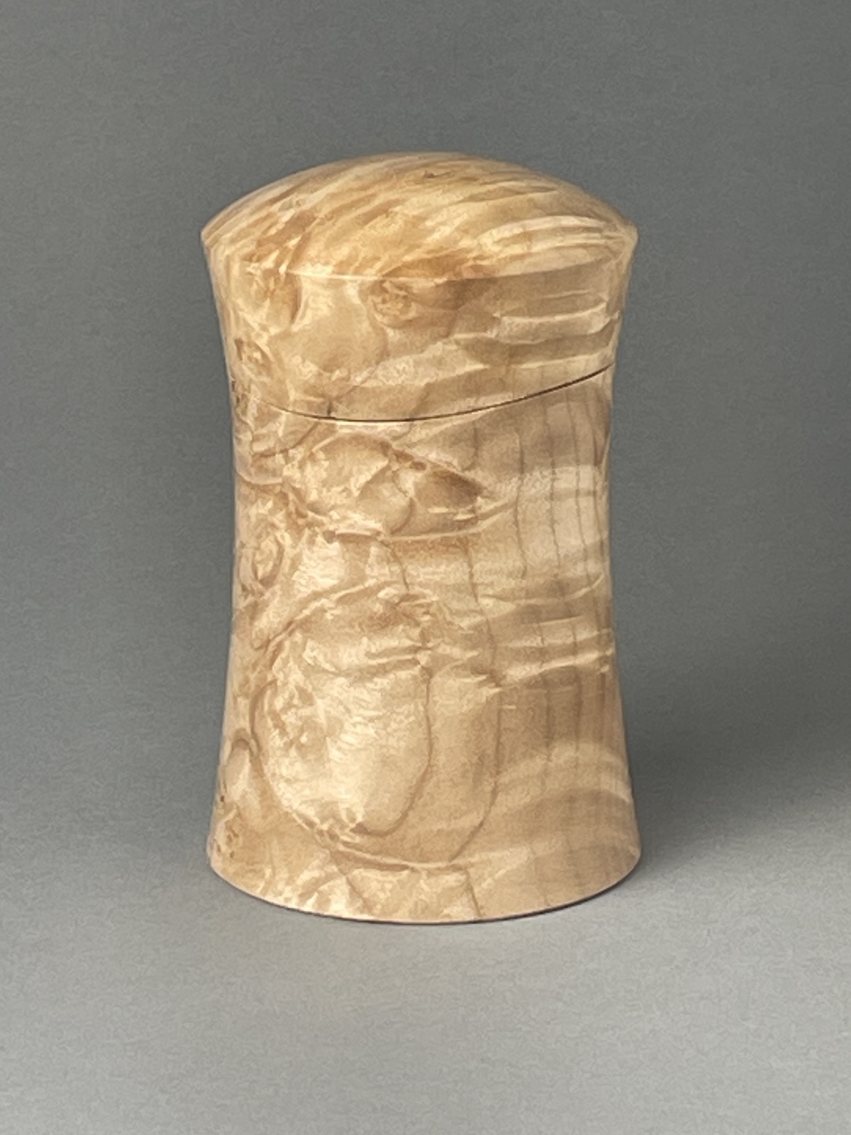 Having fun making these boxes. This one is maple burl, about 4.5″ tall, 2.75″ diameter, and the interior is about 2″ diameter.