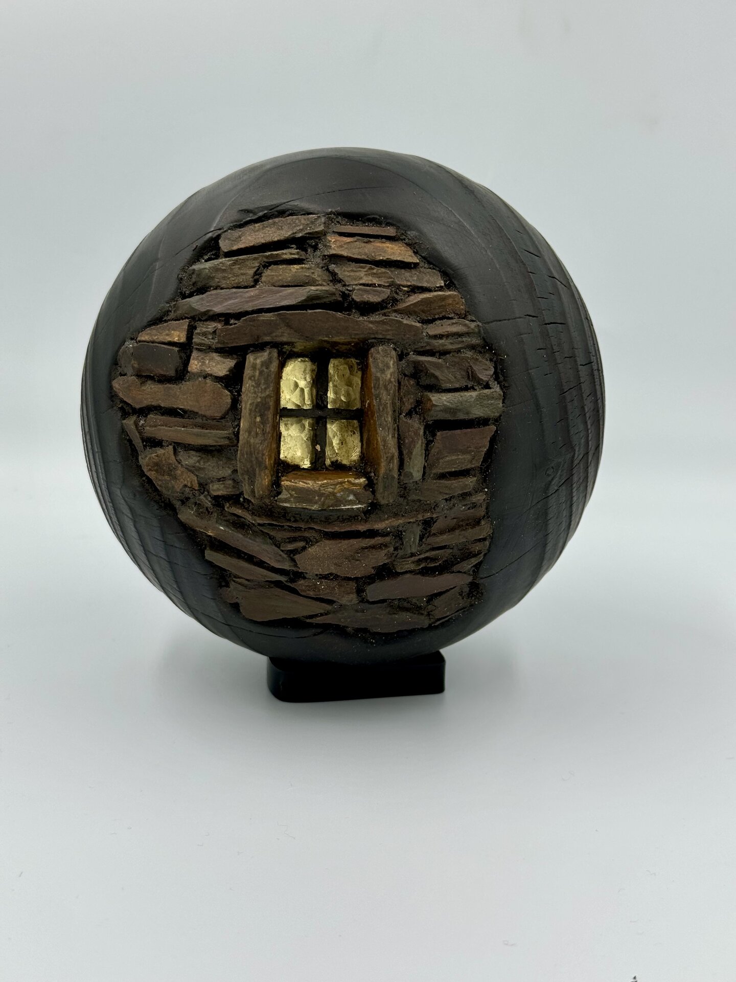 Cedar sphere, 15 cm. Inlay of ferruginous slate and brass.