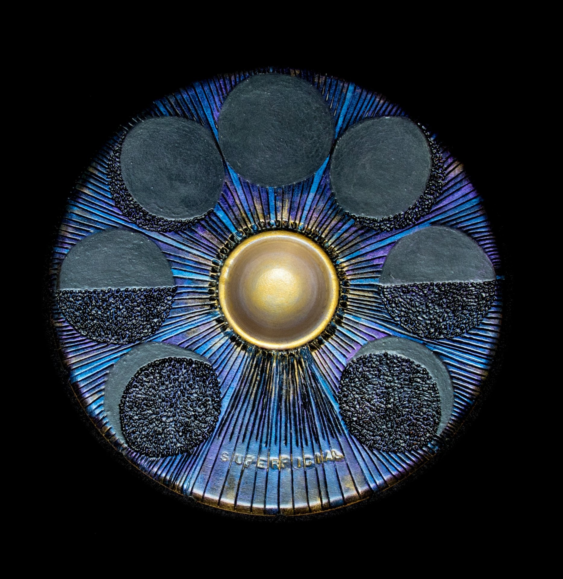 At the monthly meeting at Michael Kehs Studio, we were given a 2 word challenge. We blindly chose a noun and an adjective and made a piece inspired by those words. So many people participated, and the work was edgy and cool. My words were Superficial Night. This piece was carved, burned, painted Fanta Black, gilded, and lastly made to glow in the dark. Michael inspires us all so much