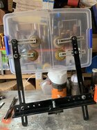 I have upgraded the screws from M6 to M8 added heavy locking washers with nuts tack welded in place, all the slots in the steel sections were cut with a 1mm 4" grinder. The short arms holding the wheels were parts seconded off an older steady that was lying around.